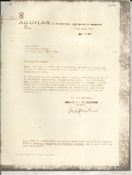[Carta] 1971 July 26, New York, [EE.UU.] [a] M. Aguilar, Aguilar S. A. de Ediciones, Madrid, Spain [manuscrito] Joan Daves.