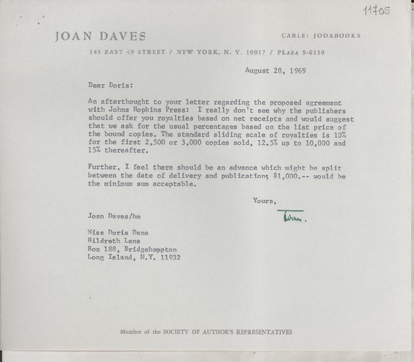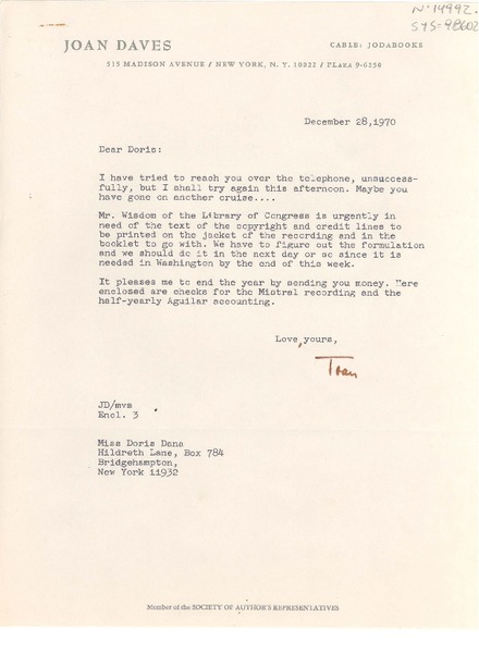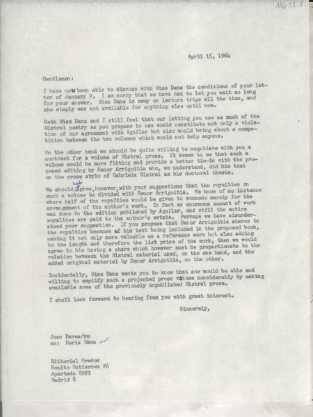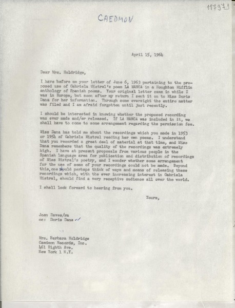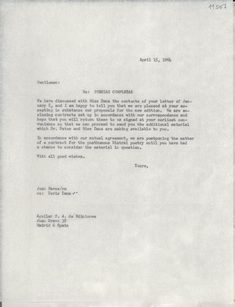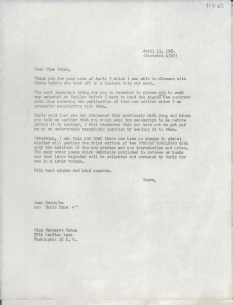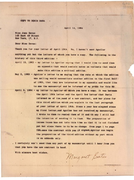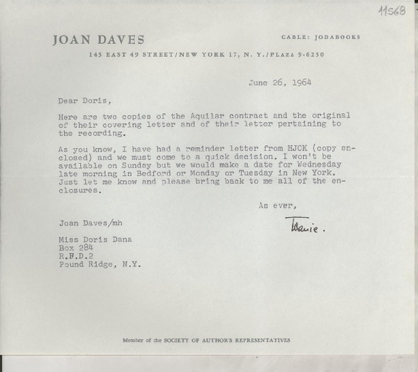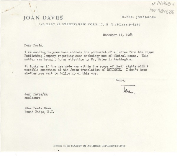 [Carta] 1961 Apr. 6, 15 East 48 Street, New York 17, N. Y., [EE.UU.] [a] Miss Doris Dana, Hack Green Road, Pound Ridge, N. Y., [EE.UU.] [manuscrito] Joan [Daves].