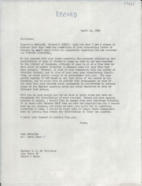 [Carta] 1961 apr. 14, [New York, Estados Unidos] [a] Richard Whelan, con copia a Doris Dana, New York, [Estados Unidos] [manuscrito] [Joan Daves].