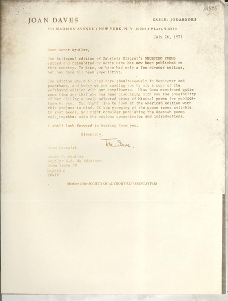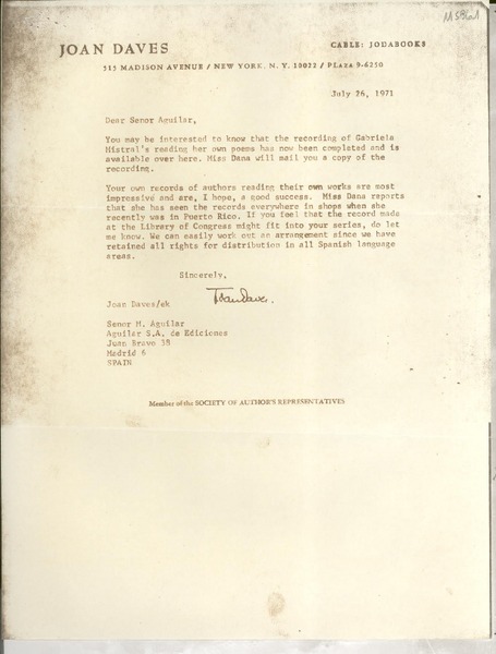 [Carta] 1971 July 26, [EE.UU.] [a] M. Aguilar, Aguilar S. A. de Ediciones, Madrid, Spain [manuscrito] Joan Daves.
