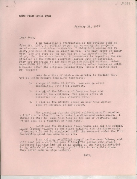 Memo 1967 Jan. 28, [EE.UU.] [a] Joan Daves, [EE.UU.] [manuscrito] Doris Dana.
