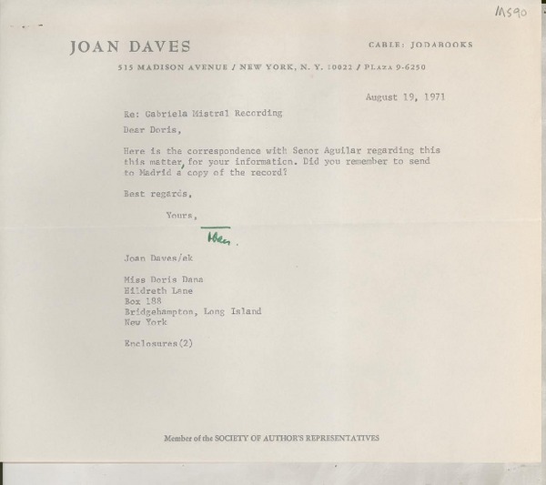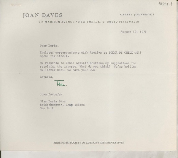 [Carta] 1972 Aug. 22, [New York, Estados Unidos] [a] Ms. Doris Dana, Box 188, Hildreth Lane, Bridgehampton, New York [manuscrito] Joan Daves.