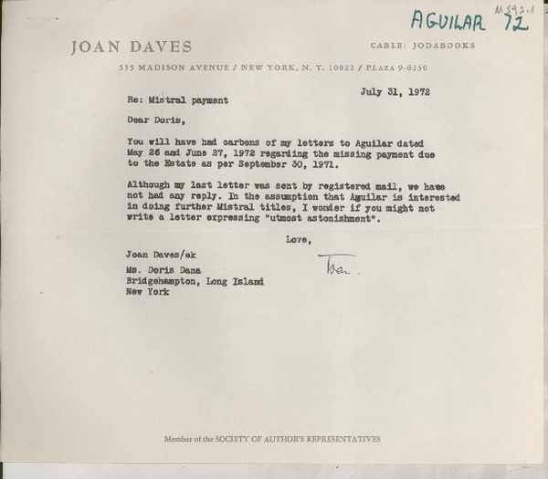 [Carta] 1972 July 31, New York, [EE.UU.] [a] Ms. Doris Dana, Bridgehampton, Long Island, New York, [EE.UU.] [manuscrito] Joan Daves.
