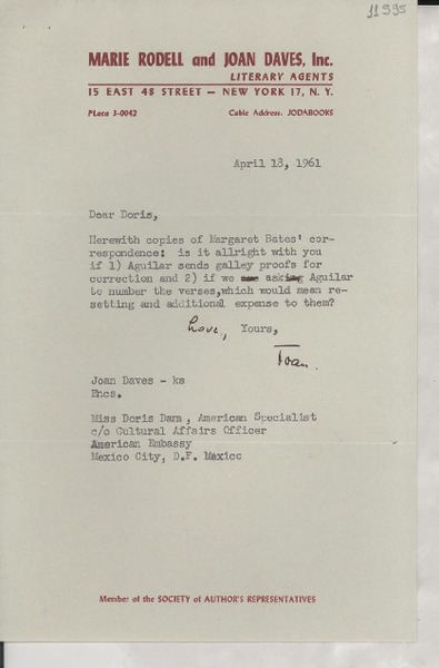 [Carta] 1961 Apr. 18, New York, [EE.UU.] [a] Doris Dana, American Embassy, Mexico City, D.F. Mexico [manuscrito] Joan [Daves].