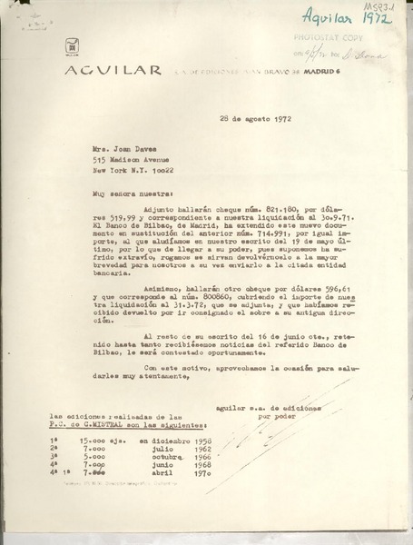 [Carta] 1972 ago. 28, Madrid, [España] [a] Mrs. Joan Daves, New York, [EE.UU.] [manuscrito] Aguilar S. A. de Ediciones.