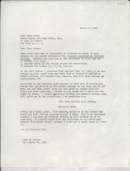 [Carta] 1961 Apr. 15, [Estados Unidos] [a] Miss Joan Daves, Marie Rodell and Joan Daves, Inc. 15 East 48 Street, New York 17, N. Y. [manuscrito] Margaret Bates.