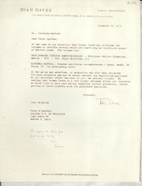 [Carta] 1973 Dec. 14, New York, [EE.UU.] [al] Señor M. Aguilar, Aguilar S. A. de Ediciones, Madrid, Spain [manuscrito] Joan Daves.