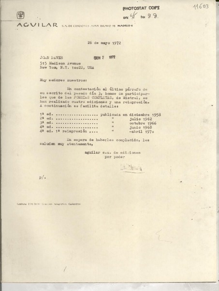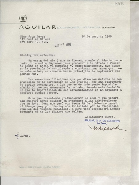 [Carta] 1972 mayo 26, [Madrid, España] [a] Joan Daves, 515 Madison Avenue, New York, N. Y., USA [manuscrito] Aguilar S. A. de Ediciones.