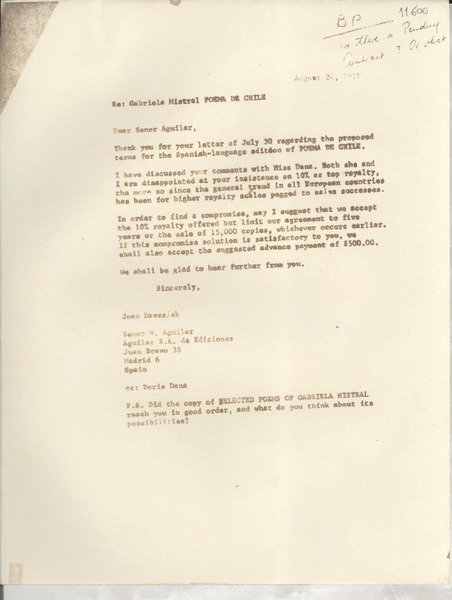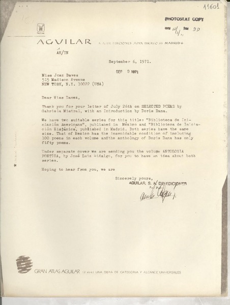 [Carta] 1971 Sept. 6, Madrid [España] [a] Miss Joan Daves, 515 Madison Avenue, New York, N. Y. 10022 (USA) [manuscrito] Aguilar S. A. de Ediciones.