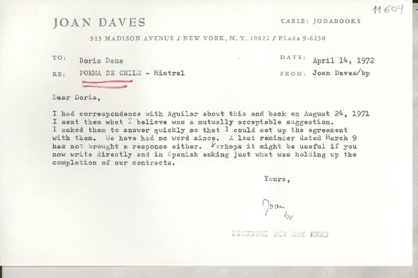 [Carta] 1972 Apr. 14, [New York, Estados Unidos] [a] Doris Dana [manuscrito] Joan Daves.