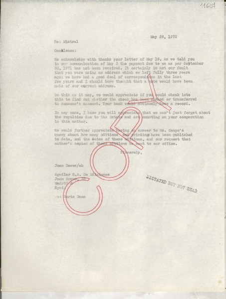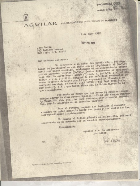 [Carta] 1972 mayo 19, [Madrid, España] [a] Joan Daves, 515 Madison Avenue, New York, N. Y. [manuscrito] Aguilar S. A. de Ediciones.