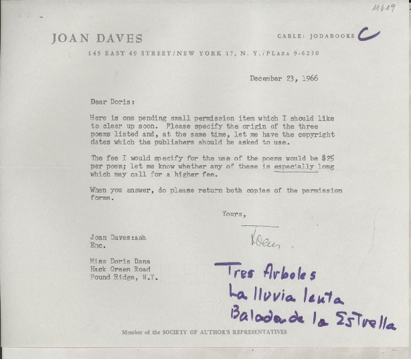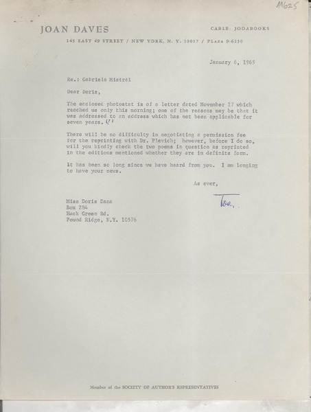 [Carta] 1959 June 23, [New York, Estados Unidos] [a] Miss Doris Dana, 204 East 20 St., New York. [manuscrito] Joan Daves.