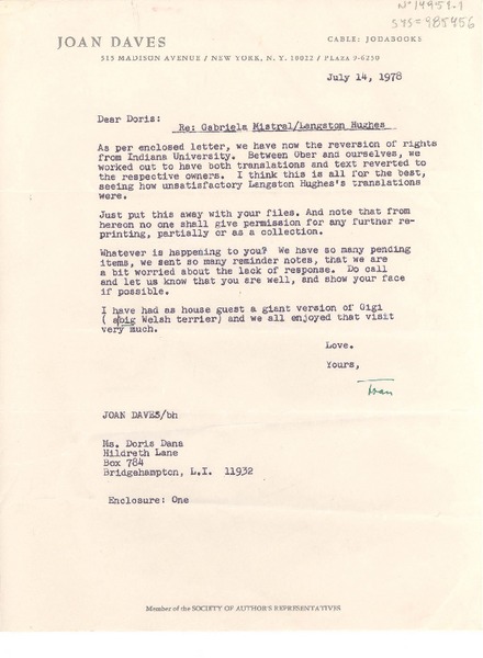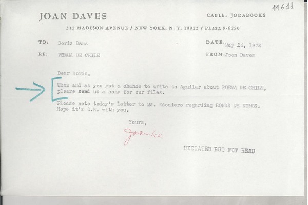 [Carta] 1978 May 10, [New York, Estados Unidos] [a] Doris Dana [manuscrito] Joan Daves.