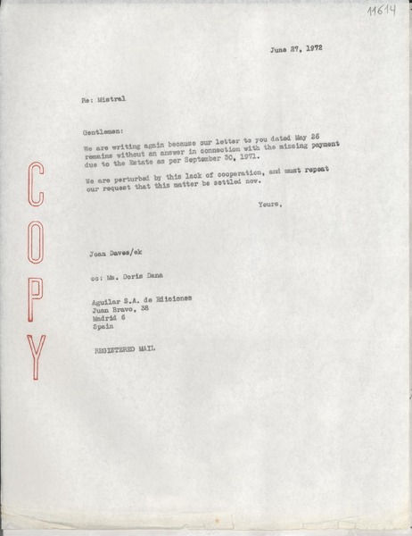 [Carta] 1972 June 27, [Estados Unidos] [a] Aguilar S. A. de Ediciones, Juan Bravo 38, Madrid, Spain [manuscrito] Joan Daves.