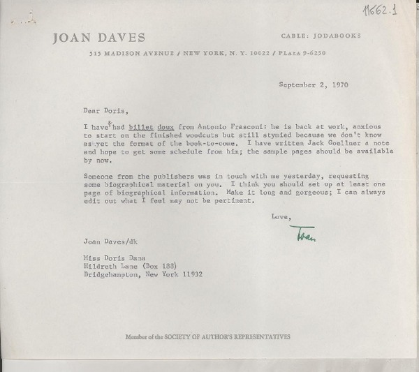 [Carta] 1971 June 9, 515 Madison Avenue, New York, N. Y. 10022, [EE.UU.] [a] Dear Doris [manuscrito] Joan Daves.