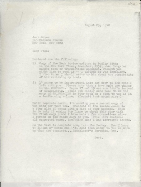 [Carta] 1972 Aug. 9, [EE.UU.] [a] Ms. Margaret McElderry, Atheneum Publishers, 122 E. 42nd Street, [EE.UU.] [manuscrito] Joan Daves.
