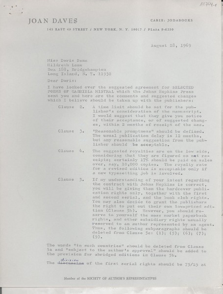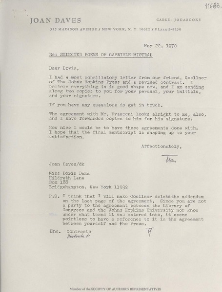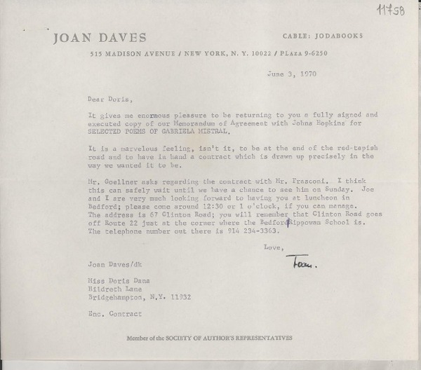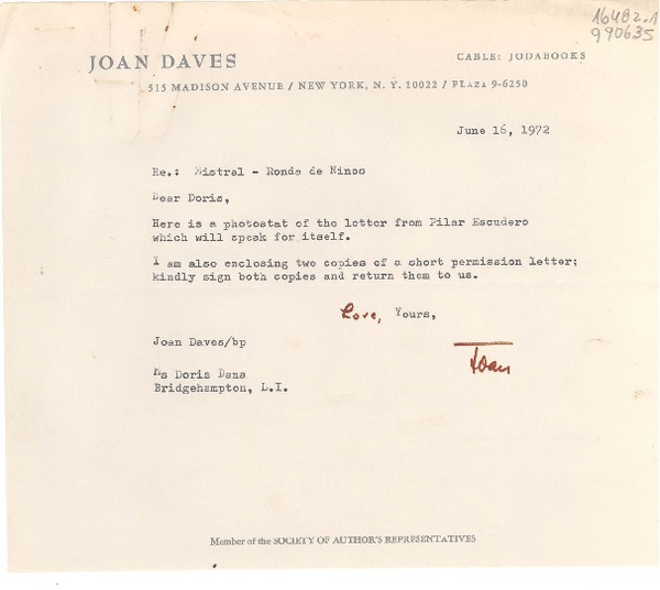 [Carta] 1972 jun. 15, [Estados Unidos] [a] Doris Dana, con copia a Margaret Bates, Bridgehampton, Long Island, [Estados Unidos] [manuscrito] Joan Daves.