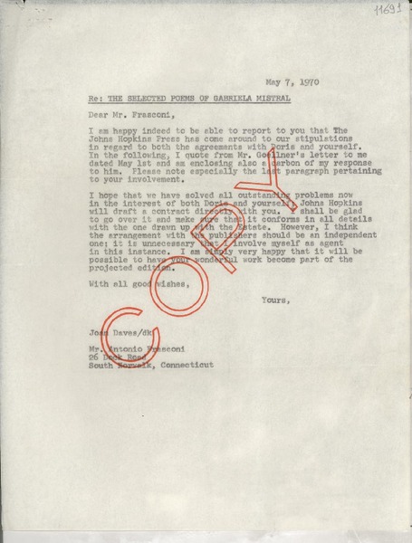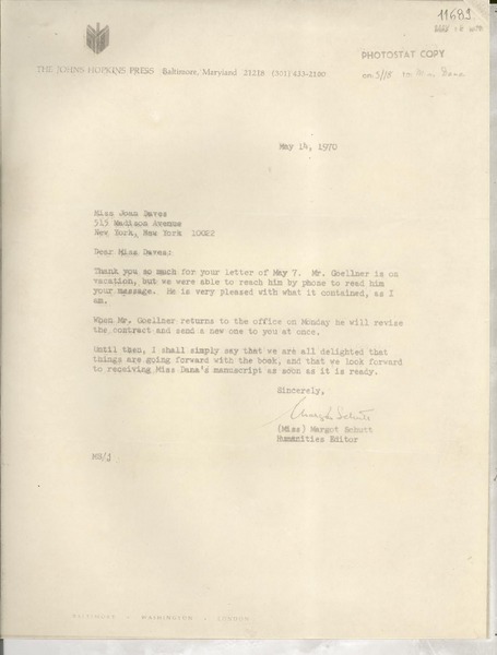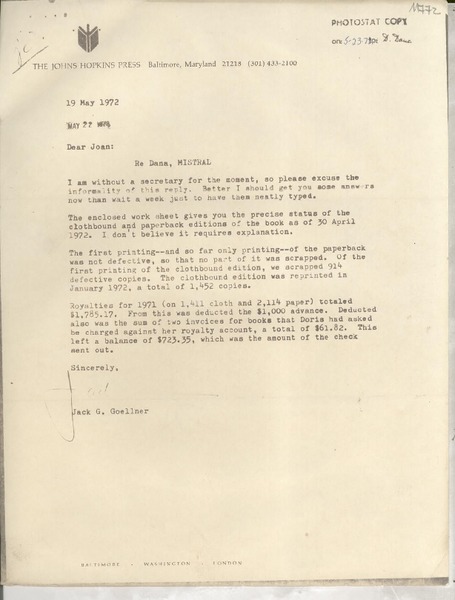 [Carta] 1971 May 28, [EE.UU.] [a] Mr. Jack G. Goellner, The Johns Hopkins Press, Baltimore, Md, [EE.UU.] [manuscrito] Joan Daves.