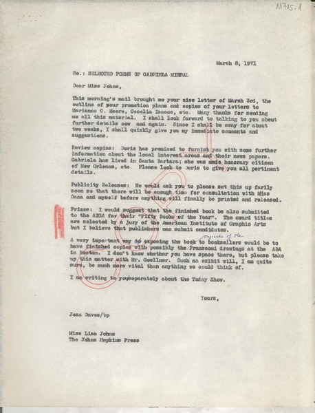 [Carta] 1971 Mar. 8, [EE.UU.] [a] Miss Lisa Johns, The Johns Hopkins Press, [EE.UU.] [manuscrito] Joan Daves.