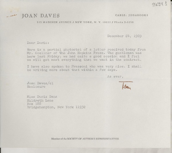 [Carta] 1957 Jan. 11, 112 East 19 Street, New York 3, N. Y., [EE.UU.] [a] Doris [manuscrito] Joan Daves.