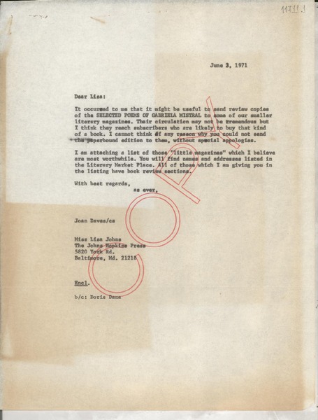 [Carta] 1971 June 2, [Estados Unidos] [a] Miss Lisa Johns, The Johns Hopkins Press, 5820 York Rd., Baltimore, Md. [manuscrito] Joan Daves.