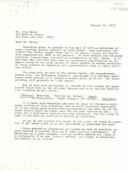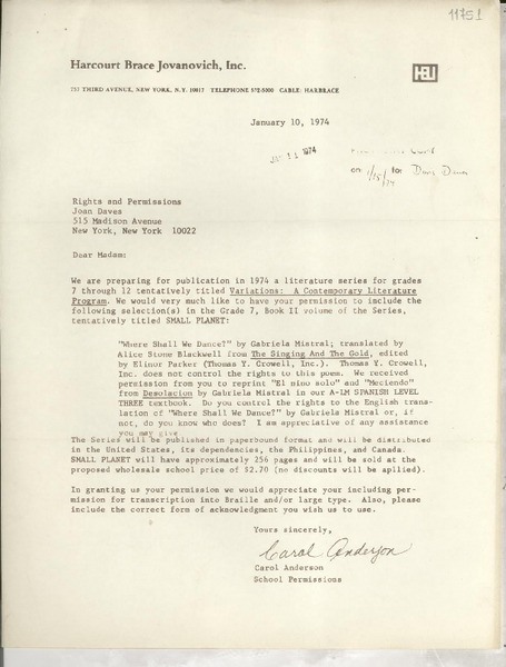 [Carta] 1974 Jan. 10, [New York, Estados Unidos] [a] Rights and Permissions, Joan Daves, 515 Madison Avenue, New York [manuscrito] Carol Anderson.