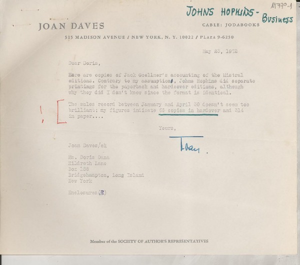 [Carta] 1971 June 21, The Johns Hopkins Press, Baltimore, Maryland 21218, [EE.UU.] [a] Miss Joan Daves, 515 Madison Avenue, New York, New York 10022, [EE.UU.] [manuscrito] Frank Saul, Sales Manager.