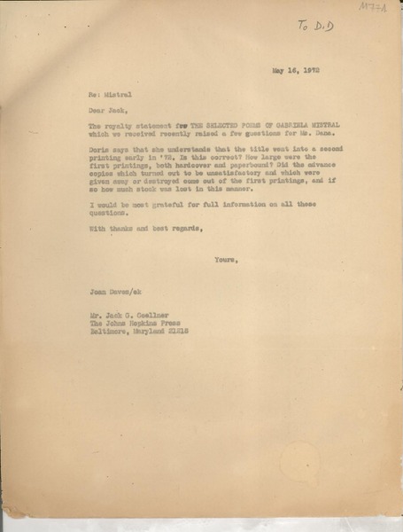 [Carta] 1972 May 16, [EE.UU.] [a] Mr. Jack G. Goellner, The Johns Hopkins Press, Baltimore, Maryland, [EE.UU.] [manuscrito] Joan Daves.