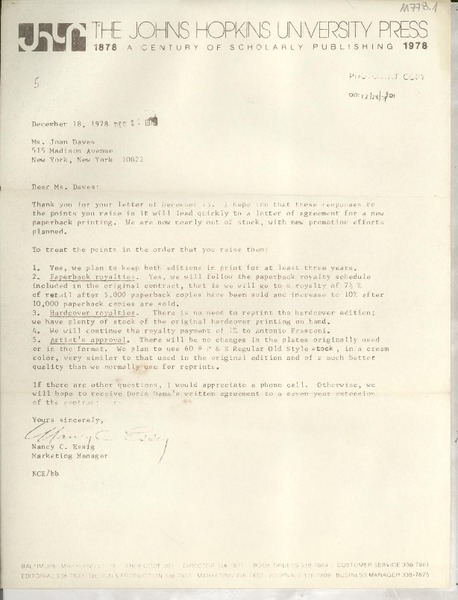 [Carta] 1978 Dec. 18, [EE.UU.] [a] Ms. Joan Daves, New York, New York, [EE.UU.] [manuscrito] Nancy C. Essig.
