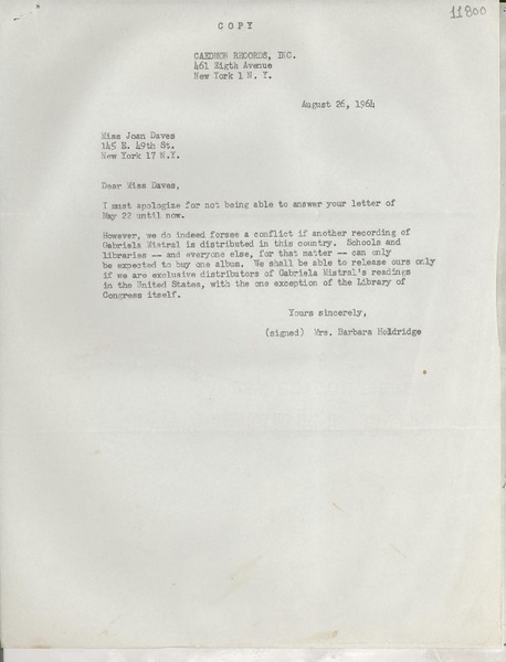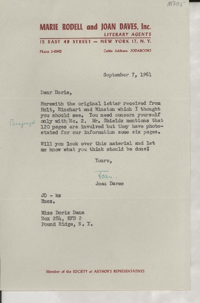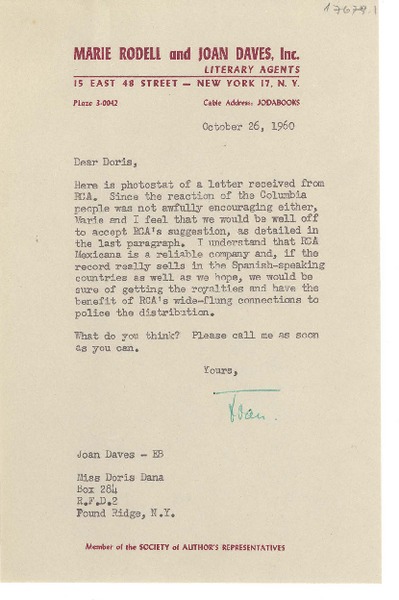 [Carta] 1961 sep. 11, New York [a] RCA Victor Record Division, N.Y. [manuscrito] Joan Daves and Marie Rodell.