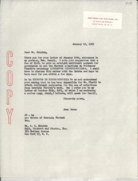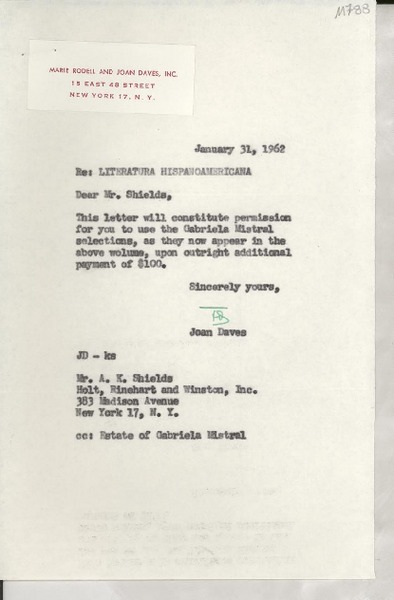 [Carta] 1961 Oct. 24, [EE.UU.] [a] Mr. A. K. Shields, Holt, Rinehart and Winston, Inc., New York, [EE.UU.] [manuscrito] Joan Daves.