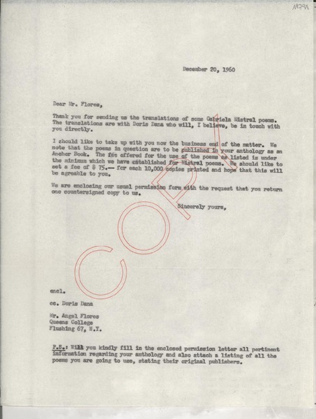 [Carta] 1960 Dec. 20, [EE.UU.] [a] Mr. Angel Flores, Queens College, N. Y., [EE.UU.] [manuscrito] [Joan Daves].