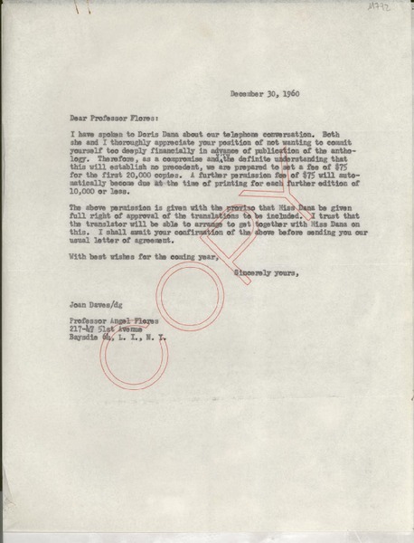 [Carta] 1960 Dec. 30, [EE.UU.] [al] Professor Angel Flores, N. Y., [EE.UU.] [manuscrito] Joan Daves.