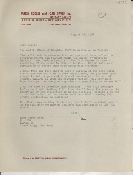 [Carta] 1962 Aug. 16, [New York, Estados Unidos] [a] Miss Doris Dana, Box 284, Pound Ridge, New York [manuscrito] Joan Daves.