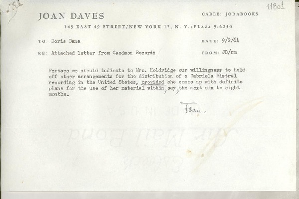 [Carta] 1961 Sept. 7, New York, N. Y., [EE.UU.] [a] Miss Doris Dana, Pound Ridge, N. Y., [EE.UU.] [manuscrito] Joan Daves.