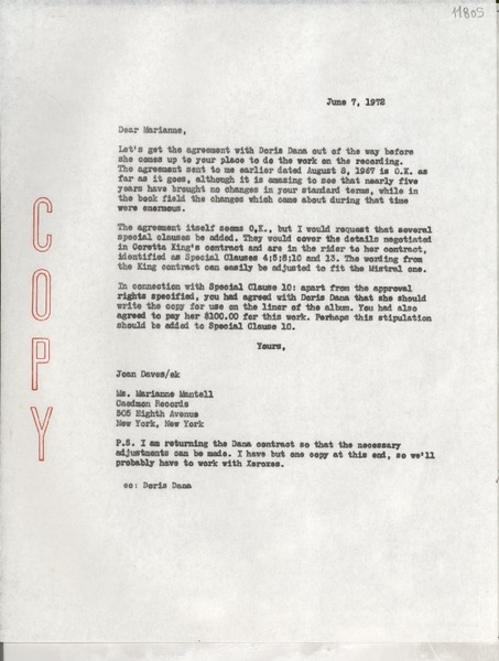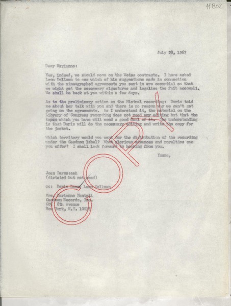 [Carta] 1972 June 7, [Estados Unidos] [a] Mrs. Marianne Mantell, Caedmon Records, Inc., New York [manuscrito] Joan Daves.