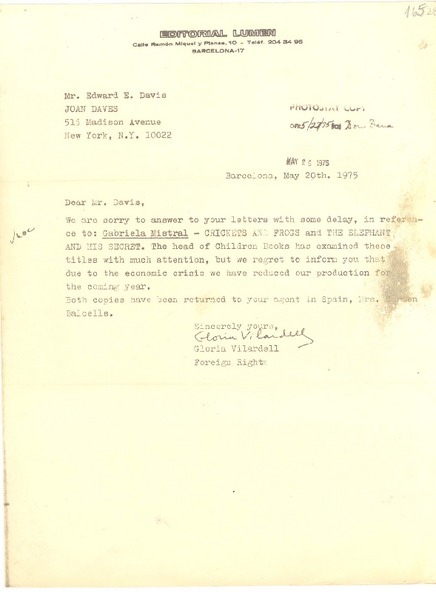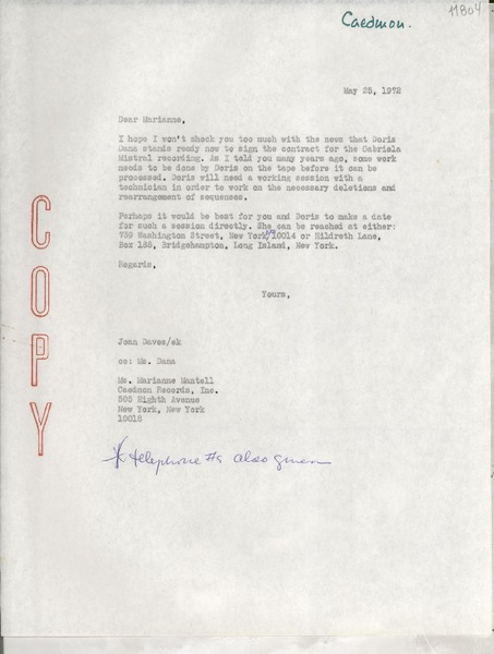 [Carta] 1972 May 25, [Estados Unidos] [a] Mrs. Marianne Mantell, Caedmon Records, Inc., New York [manuscrito] Joan Daves.
