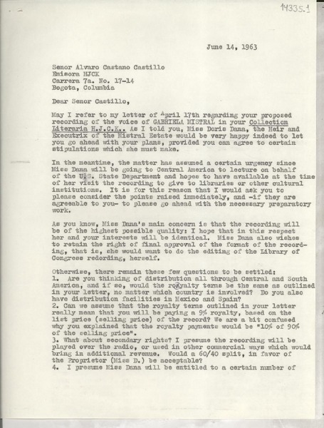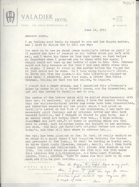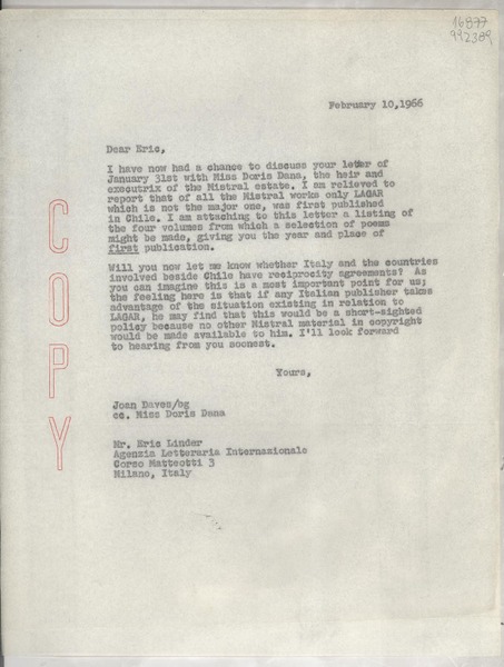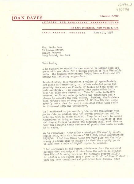 [Carta] 1956 jun. 14, [New York, Estados Unidos] [a] Doris Dana, Long Island, New York, [Estados Unidos] [manuscrito] Joan Daves.
