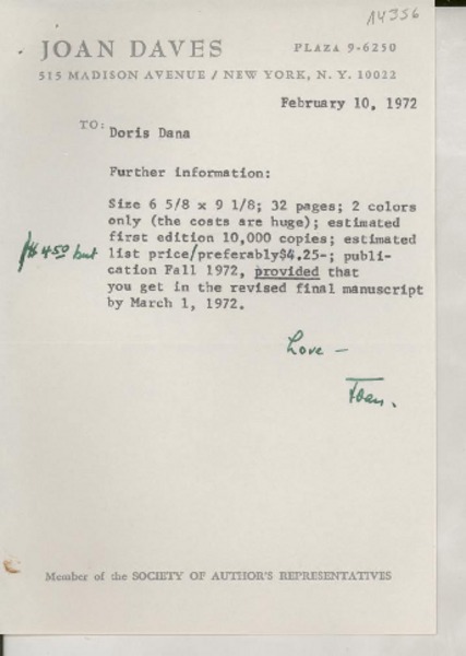 [Carta] 1972 Feb. 10, 515 Madison Avenue, New York, N.Y. 10022, Plaza 9-6250, [EE.UU.] [a] Doris Dana [manuscrito] Joan Daves.