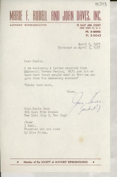 [Carta] 1957 Apr. 8, [New York, Estados Unidos] [a] Miss Doris Dana 204 East 20th Street, New York City 3, New York [manuscrito] Joan Daves.