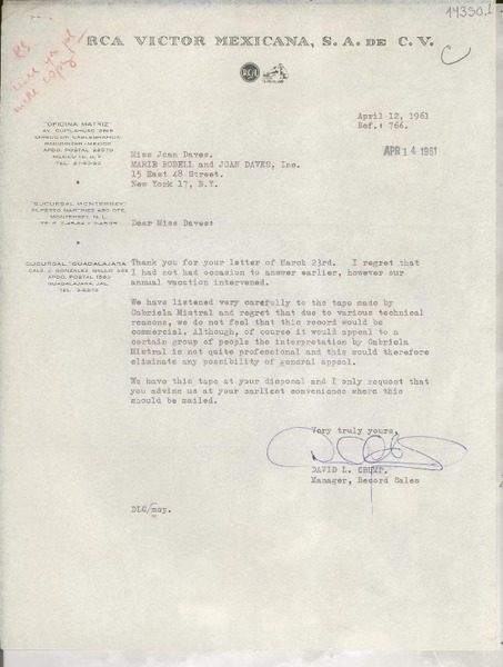 [Carta] 1961 Apr. 12, [México D. F.] [a] Miss Joan Daves, Marie Rodell and Joan Daves, Inc., 15 east 48 Street, New York 17, N. Y. [manuscrito] David L. Crump.