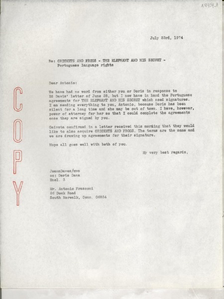 [Carta] 1974 July 23, [EE.UU.] [a] Mr. Antonio Frasconi, 26 Dock Road, South Norwalk, Conn. 06854, [EE.UU.] [manuscrito] Joan Daves.