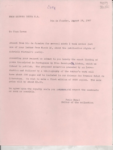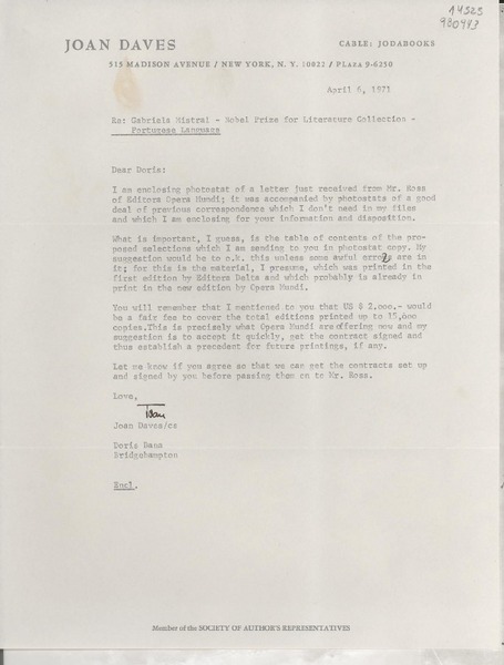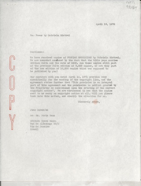 [Carta] 1972 Apr. 13, [EE.UU.] [a la] Editora Opera Mundi, Rua da Alfandega 982, Rio de Janeiro, Brasil [manuscrito] / Joan Daves.