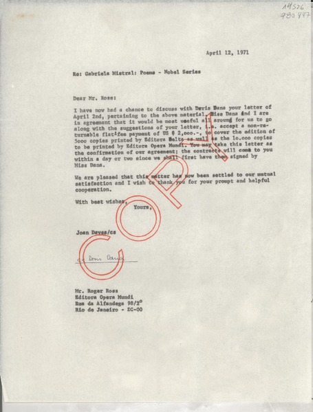 [Carta] 1971 Mar. 26, [Estados Unidos] [a] Mr. Roger Ross, Editora Opera Mundi S. A., av. Paulista 1765, Sao Paulo, Brazil [manuscrito] Joan Daves.