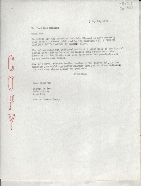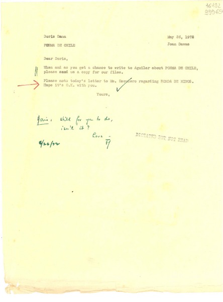 [Carta] 1972 May 26, [New York, Estados Unidos] [a] Doris Dana [manuscrito] Joan Daves.