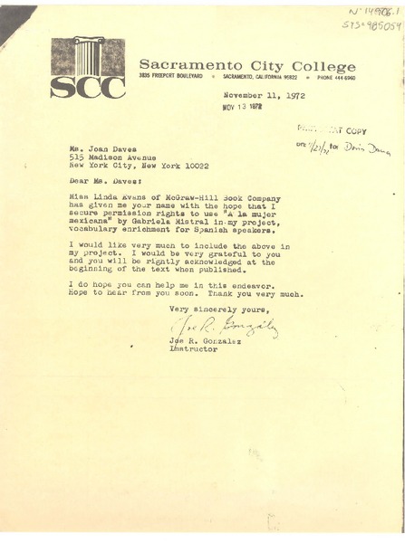 [Carta] 1972 nov. 11, [Sacramento, California, Estados Unidos] [a] Joan Daves, New York, [Estados Unidos] [manuscrito] Joe R. Gonzalez.