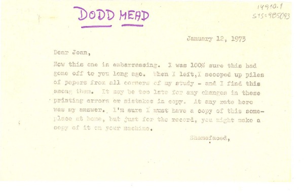 [Carta] 1973 Jan. 12, [Estados Unidos] [a] Dear Joan [manuscrito] [Doris Dana].