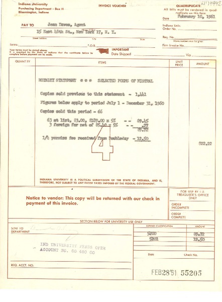 [Recibo] 1959 jul. 22, [Bloomington, Indiana, Estados Unidos] [a] Joan Daves, New York, [Estados Unidos] [manuscrito] Indiana University Press.