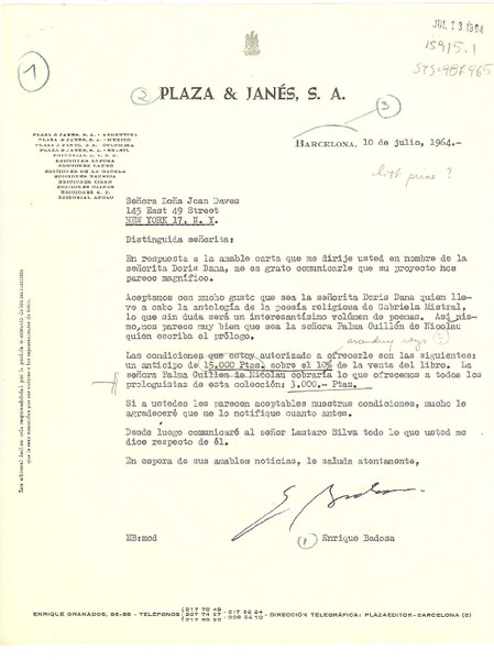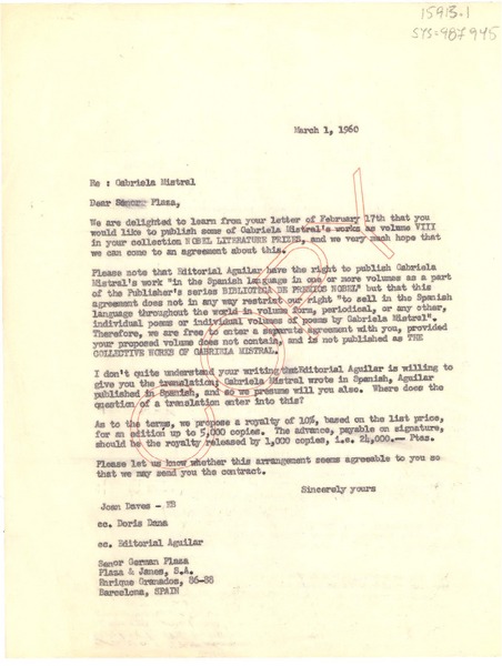 [Carta] 1960 mar. 1, [Estados Unidos] [a] Germán Plaza, Plaza & Janes, S.A., Barcelona, Spain [manuscrito] Joan Daves, cc. Doris Dana.