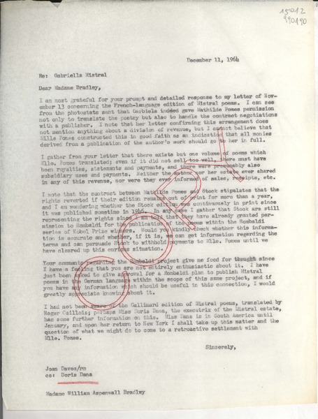 [Carta] 1956 Dec. 7, Joan Daves, 112 East 19th Street, New York 3, N. Y., [EE.UU.] [a] Mrs. Doris Dana, Roslyn Harbour, L. I., New York, [EE.UU.] [manuscrito] Joan Daves.